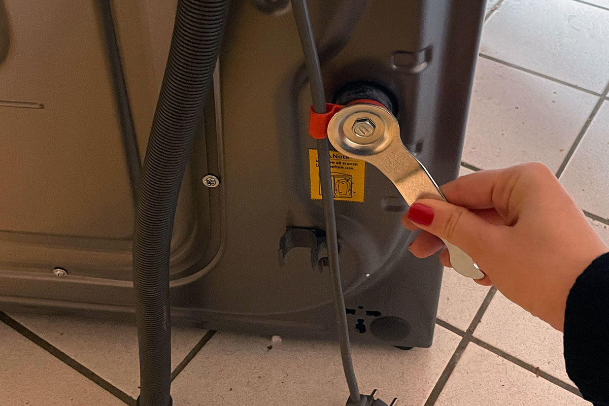 Steht der Waschtrockner in seiner endgültigen Position, ist es wichtig, ihn gerade auszurichten. Dafür lassen sich die Füße herausdrehen, wofür praktischerweise ebenfalls der mitgelieferte Schraubenschlüssel passt. Die Wasserwaage muss man hingegen selbst vorrätig haben.